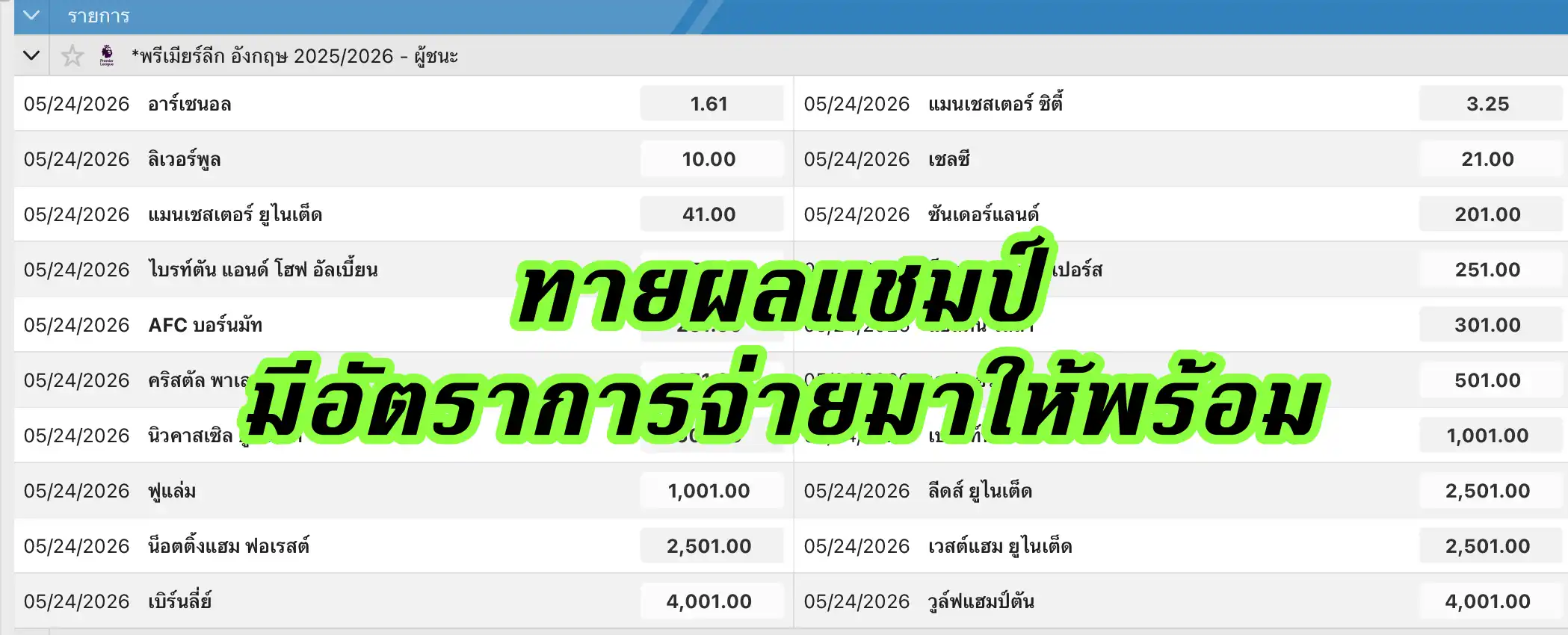 “เมื่อท่านมีทีมที่เชียร์ ก็อย่าเชียร์แบบเสียเปล่า ลองแทงบอลทายผลแชมป์กันดู ถือว่าเล่นเอาไง้ลุ้นสนุกๆกันก็ได้ครับ”